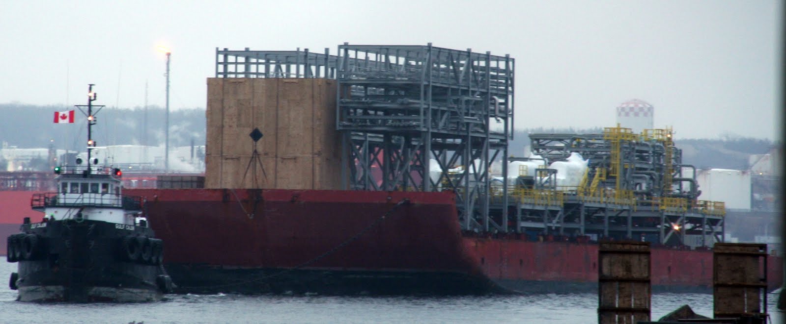 UPDATE: Her destination is Long Harbour Newfoundland. This is the Base of operations for the Voisey’s Bay Nickle Operation, and currently has a processing plant under construction. This is likley componenets for the plant.