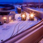 The BNSF yard in Galesburg, IL provides the scene for a departing train on a crisp winter night.